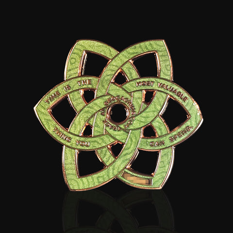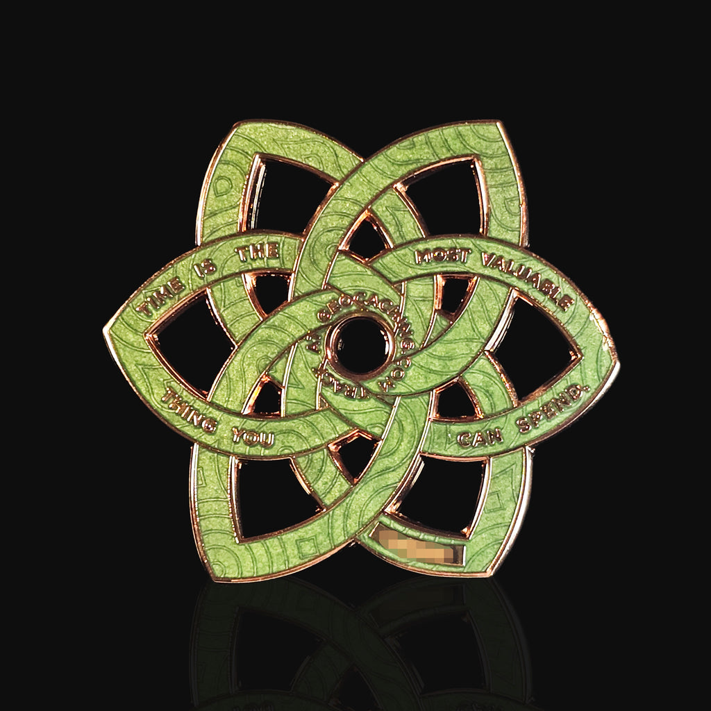 These were inspired by a mix of my Mandala coins, as well as a Celtic Knot, with an interwoven design and a few 3D details. And on the back has the text 'Time is the most valuable thing you can spend'.